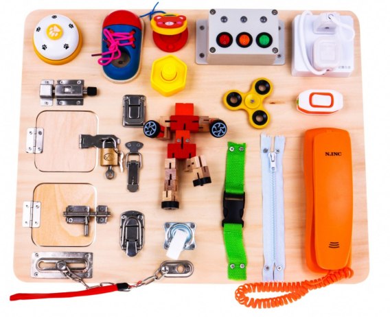 Drewniana tablica multifunkcyjna to zabawka edukacyjna, sensoryczna oraz manipulacyjna, przeznaczona dla dzieci od 3- go roku. Zestaw składa się z tablicy do której przymocowane zostały elementy z którymi dziecko spotyka się w życiu codziennym. Przez zabawę tym pakietem dziecko wspomaga umiejętności z zakresu małej motoryki, logicznego myślenia i analizy przyczynowo - skutkowej. Tablica posiada elementy dźwiękowe (dzwoneczek) oraz świetlne na sterowniku (włączniki i wyłączniki z diodą). Zestaw zasilany bateriami 2 x AA, których brak w zestawie.